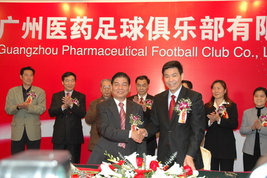 杏林盈綠意,春暖花吐艷。225日上午在白天鵝宏圖府高朋滿座。廣藥集團楊榮明董事長與廣州體育局劉江南局長簽訂合作協議,宣告廣州醫藥足球俱樂部正式成立。接著,市領導、體育局領導及廣藥集團領導為新俱樂部揭牌,并舉行了隊旗授予儀式。從此,在今年中甲聯賽中,廣州隊將以“廣州醫藥隊”的名稱征戰。