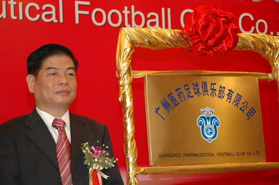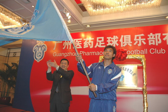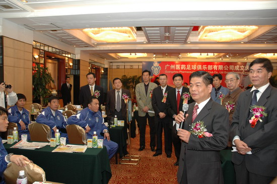 楊榮明董事長認為,廣藥與廣州足球的“聯姻”可以說是醫藥文化與足球文化的有機結合。足球運動本身與醫藥的追求始終都是為了健康,強強融合,勢不可擋。廣藥從經營角度而言,是實施品牌戰略需要。廣藥集團作為廣州國企中龍頭企業,經濟實力雄厚,屬下20多家企業達數百個產品。去年廣藥集團確定了立足廣東,“西進、北上、東擴”的新戰略。參與足球就是借足球這一全球影響力最大的項目,把廣藥推向全國以及國際?!拔覀冏①Y足球是回饋社會的一種方式。廣藥這次“涉足”,不是贊助,而是投資——俱樂部注冊資金達2000萬元。我們在著力打造中國制藥業的艦母的同時,也將全力打造足球這塊城市的名片”楊榮明解開了廣藥集團參與足球之迷,顯然是動真格的。當天,廣藥足球隊全體將士身穿藍色(廣藥CI設計主色調)隊服,讓人們眼前一亮,尤其隊徽,別有新意?!瓣牷請D案整體取廣州市木棉花的形狀;花托為一對羊角,隱喻羊城,花中心為廣藥LOGO,花蕊是皇冠,寓意廣州隊問鼎中國職業足球啊。在此,首先祝你們沖超成功”。楊榮明董事長對在座的廣州足球運動將士興致勃勃地解說新隊徽,并給他們打氣。
